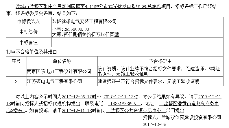 盐城市盐都区张庄全民双创园屋面4.11MW分布式光伏发电系统EPC总承包结果公示