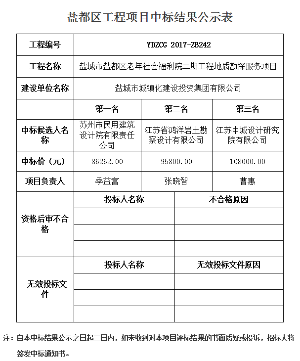 盐都区老年社会福利院二期工程地质勘探服务项目中标结果公示