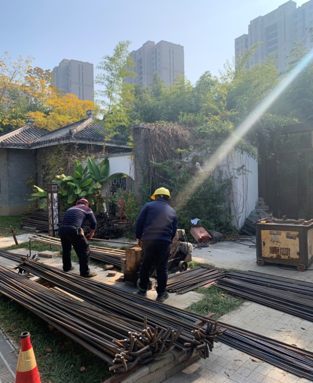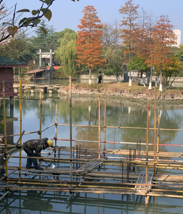 夜气温骤降,从暖秋进入寒冬,寒风劲吹,但在世纪公园内呈现在人们面前的却是一派热火朝天的施工景象,机器隆隆,电光闪烁,施工人员顶着寒风,争分夺秒,奋战在施工一线,有的在搭建脚手架、有的在焊割钢材、有的在搬运材料……