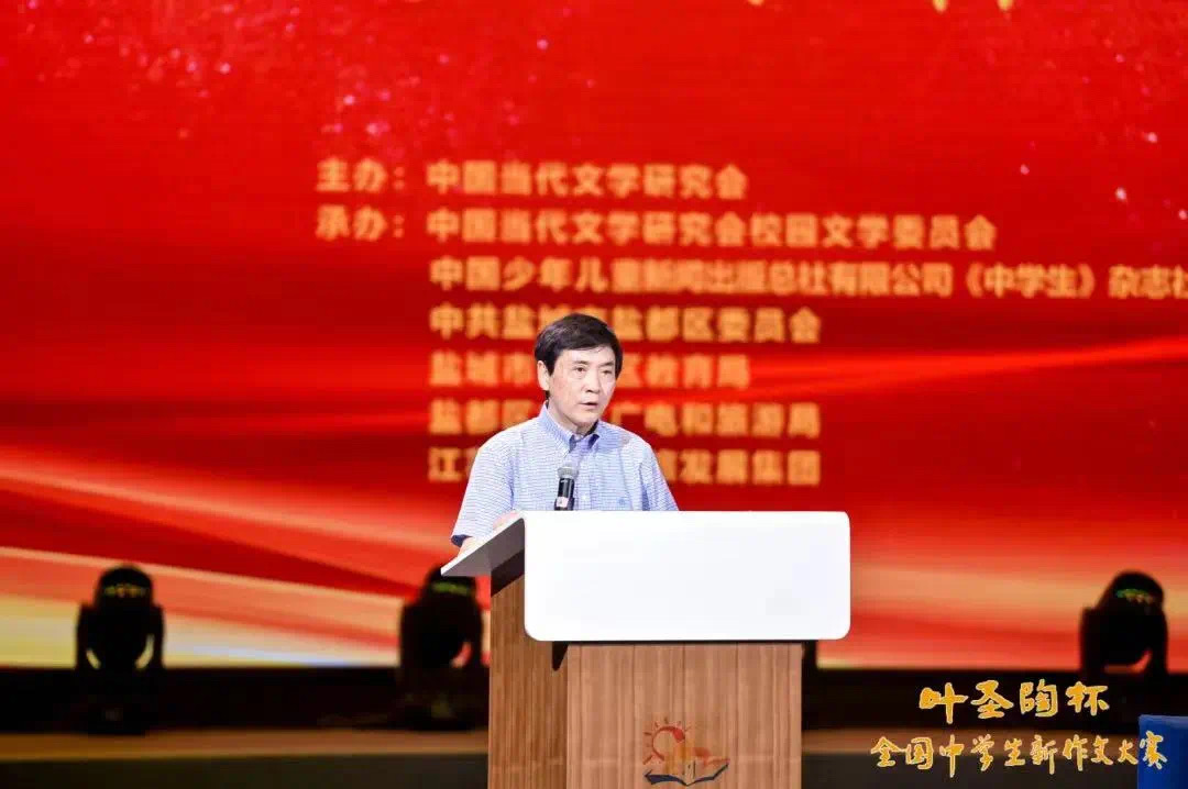 本届大赛颁奖典礼上,大赛领导小组组长、中国当代文学研究会会长、北京师范大学国际写作中心执行主任、教授张清华代表主办单位致辞。他表达了对盐城市盐都区人民政府和草房子景区以及所有支持大赛的单位的由衷谢意,对叶圣陶杯大赛的组织工作给予了充分肯定。他指出,历经二十年的辛勤耕耘,叶圣陶杯大赛已成为全国中学生写作的一个标杆,吸引了众多优秀中学生参赛,产生了众多佳作,这是对中学写作教学的推动,也是对叶圣陶等前辈大师的纪念和献礼。当代文学研究会的职能与使命不仅是文学研究与评论,还包括文学教育,而主办叶圣陶杯大赛就是践行文学教育最好的体现。大赛不仅提升了学生的写作兴趣与文学素养,发现了众多有前途的文学新苗,而且在引领着写作教学朝着健康正确的方向发展。今后的叶圣陶杯大赛要继续严格按照教育部要求,不断总结经验、提升质量,积极为培养具有文学素养与写作能力的高素质创新人才作出更大的贡献。